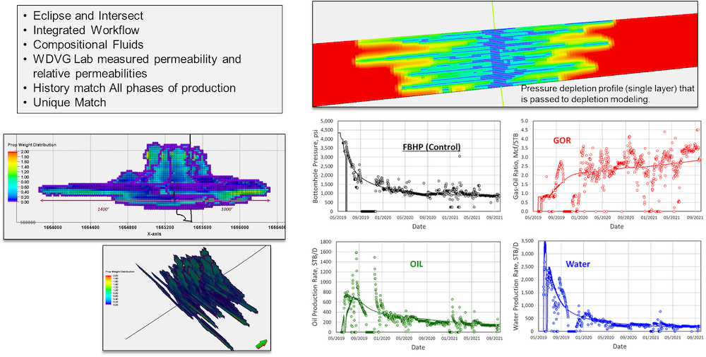 WDVGE employs a proprietary simulation model and workflow to properly account for the flow dynamics of organic mudstones. Our high-resolution hydraulic fracture models are utilized to accurately model the stimulated rock volume in conjunction with our advanced petrophysical outputs. Through integration with our extensive core testing and database, the porosity is appropriately partitioned into oil and water systems. Additionally, we have the capacity to incorporate the effect of completion fluid damage in our models which allows for sensitivity analysis of proposed completion designs. These inputs are modeled using the Petrel platform for generating three-dimensional properties and simulated using the Intersect program.