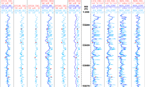 Continuous Anisotropic Ultrasonic Velocity Logging (ULT) is conducted to obtain cm-scale measurements of ultrasonic compressional (P) and shear (S) wave velocities along the length of the cored section. Measurements are performed at three different orientations to bedding and results are used to define the complete transverse isotropic elastic tensor. Results are integrated with triaxial measurements and field acoustic logs to provide a high confidence, high-resolution mechanical property log along the cored interval.